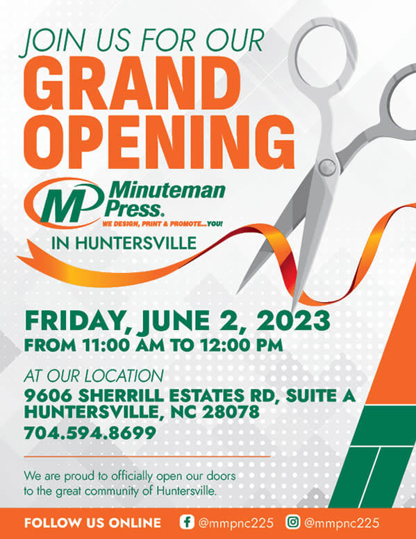 Come join us for a Ribbon Cutting of the new location of Minuteman Press. We are your one-stop solution for professional graphic design services and custom printing essentials such as business cards, brochures, flyers, banners, posters, direct mail advertising, trade show displays, promotional items featuring your logo and branding. We offer free local pick up and delivery.