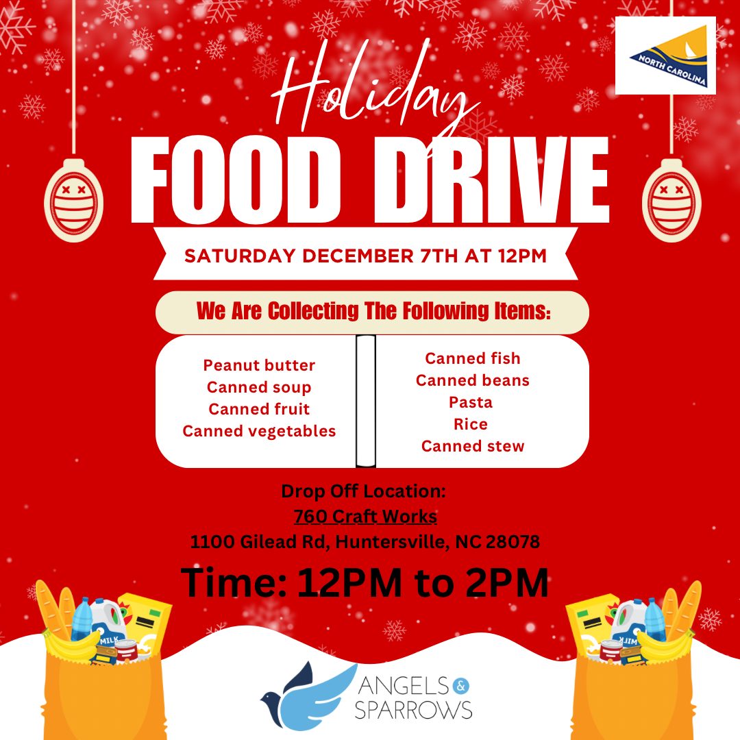 Join us for a Food Drive to Benefit Angels and Sparrows on December 7th from 12:00 to 2:00 PM at 760 Craft Works in Huntersville!