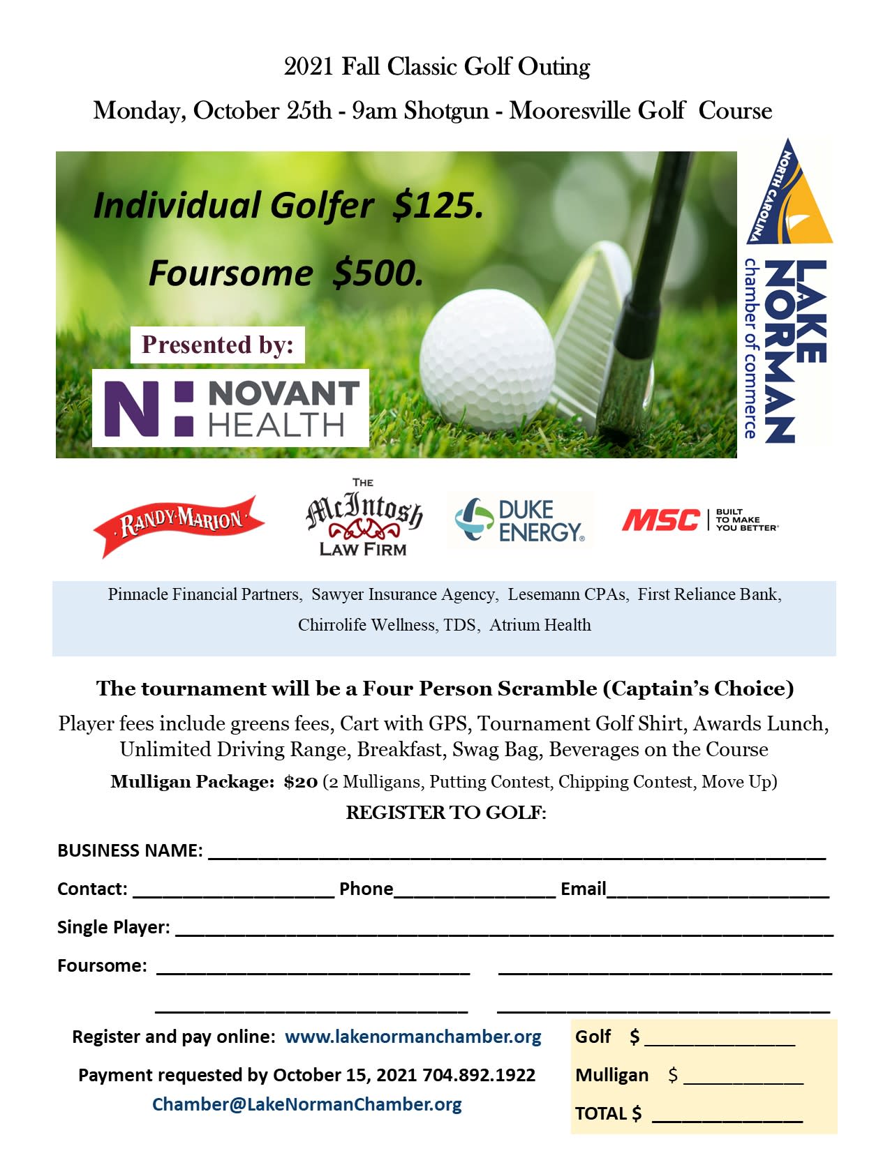 Its time again for us to begin planning our 2021 Golf Outing which will be held Monday, October 25th at the Mooresville Golf Course, 9am Shotgun Start. The tournament has sold out the last few years and we are anticipating the same for 2021. Limited to just 120 golfers. We are looking for folks to help with sponsorships, door prizes, day of the tournament registration, hole in one witness, putting the signs out, picking up at end of play